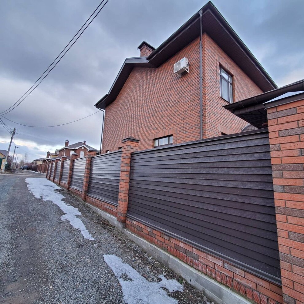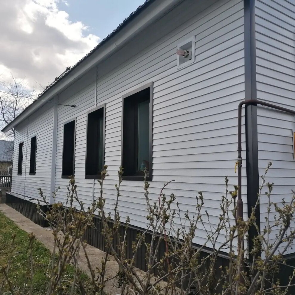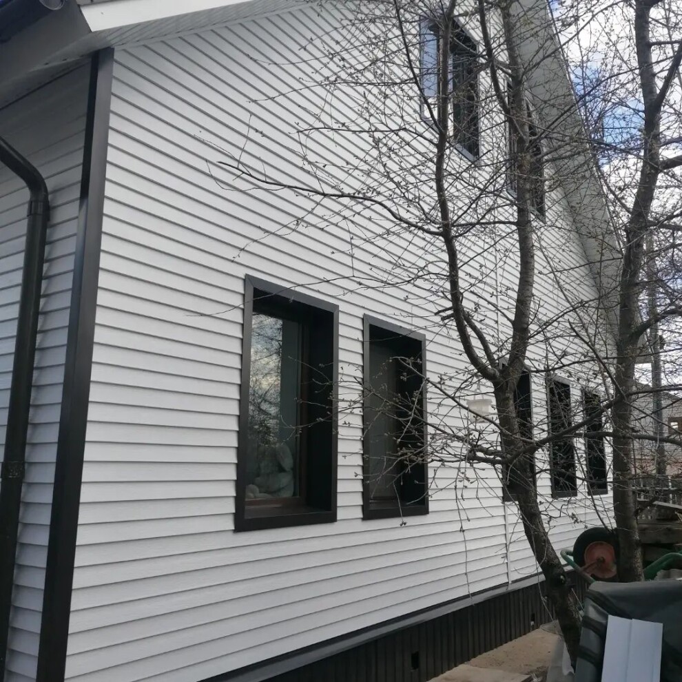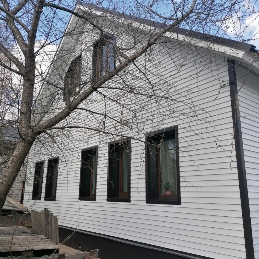 Металлический сайдинг Финская доска узкая с двойной панелью имитирует облицовку фасада натуральным деревом. Узкие, слегка наклоненные панели создают интересный орнамент в форме «ёлочки». Точно переданный рисунок натуральной древесины и текстурирование самой панели придает дому необычайно утонченный и изысканный вид.