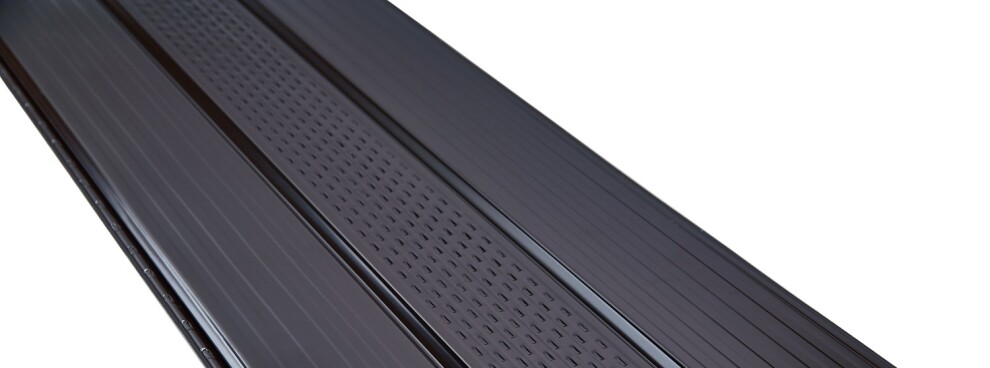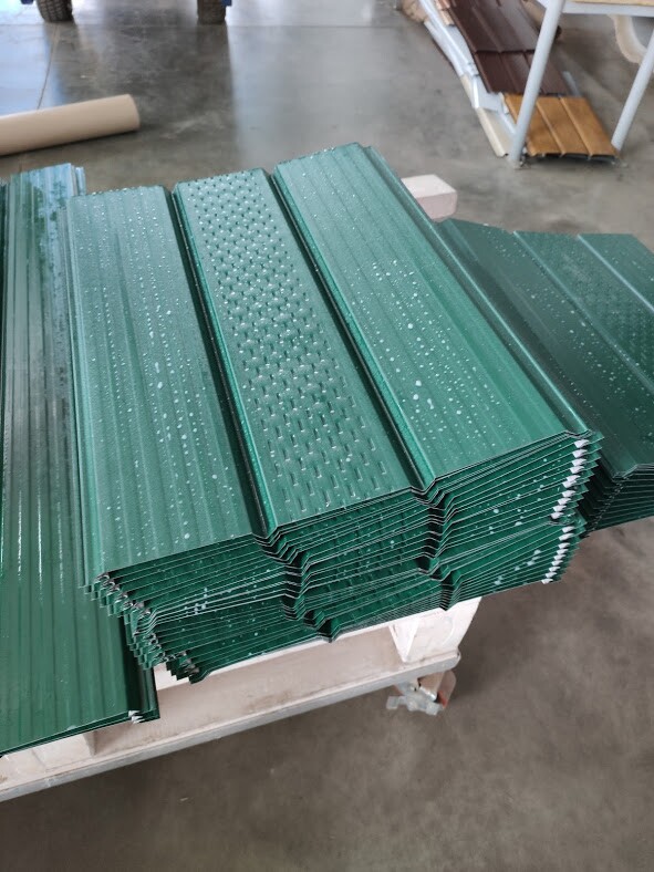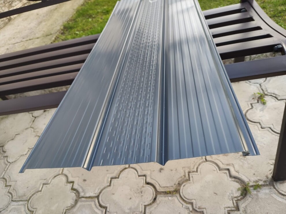 Софит с центральной перфорацией используется для подшивки свесов кровли. Через перфорацию в центральной части софита воздух поступает в вентиляционный зазор для проветривания подкровельного пространства. Выход воздуха происходит через кровельные аэраторы, вент. коньки и т.п.